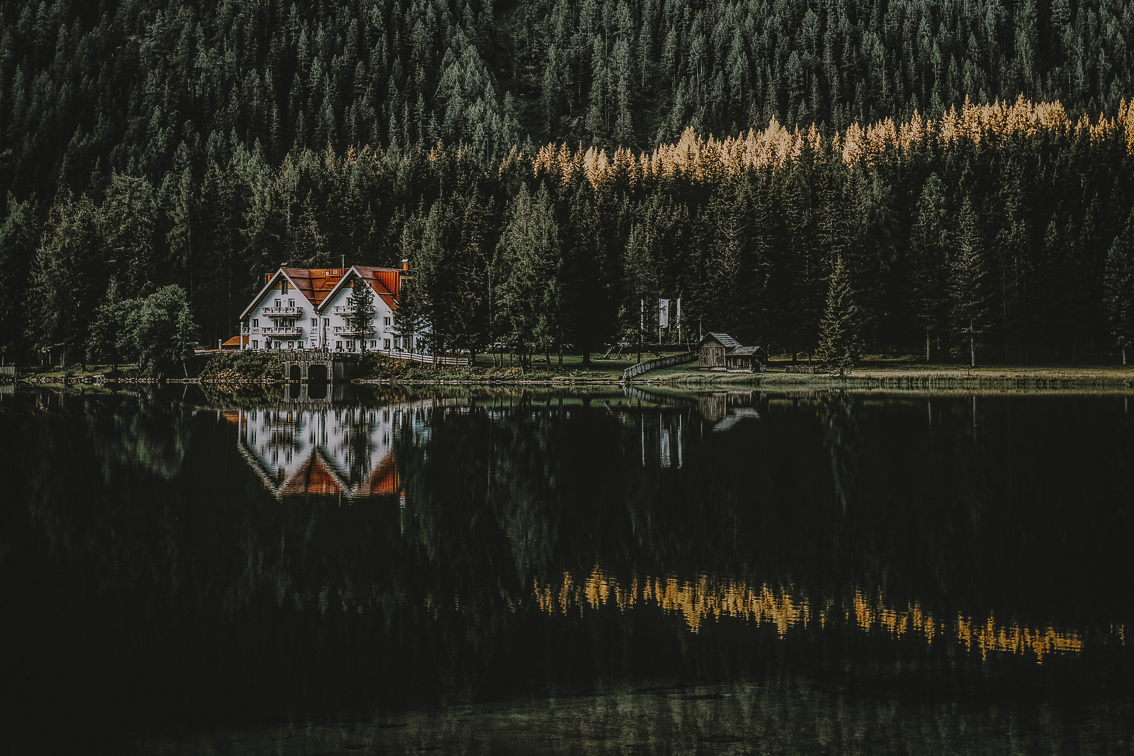木々に囲まれた水面に映る白と茶色の家の写真 Unsplashで見つける鹿角を見るの無料写真
